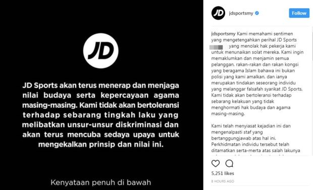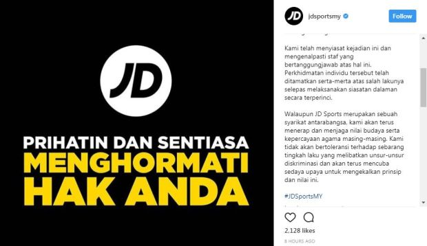 “Ia merupakan tindakan seorang individu yang melanggar falsafah syarikat JD Sports. Kami tidak akan bertoleransi terhadap sebarang kelakuan yang tidak menghormati hak budaya dan agama masing-masing.
