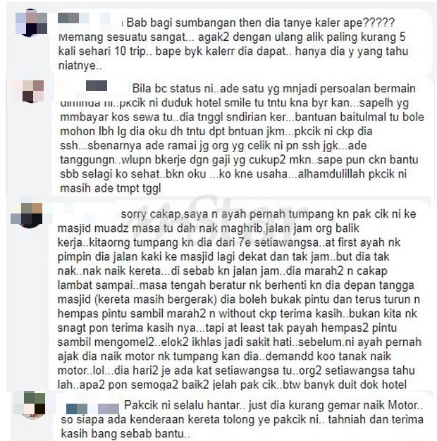 “Saya ikhlas bantu sebab saya tahu dia orang susah. Malah dalam ‘posting’ pun sudah dinyatakan ia ditulis bukan untuk riak, tapi minta jasa baik orang ramai tolong tumpangkan pakcik ni kalau ternampak dia berdiri sambil pegang kertas di kawasan berdekatan Keramat dan Setiawangsa,” katanya.