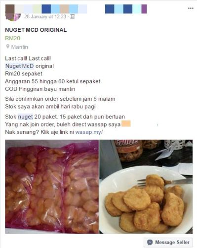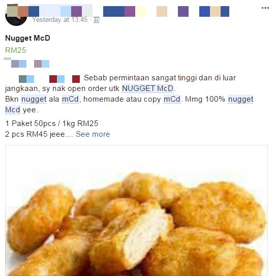 Paparan skrin promosi jualan nugget di Facebook yang didakwa peniaga sebagai nugget McDonald's.