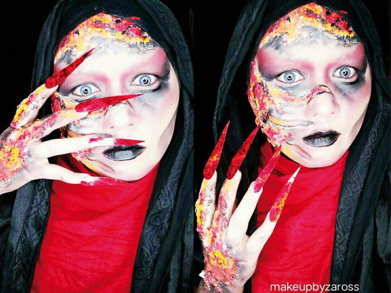 “Melangkah setapak lagi, saya semakin berani buat solekan wajah yang lebih ekstrem. Setakat ni saya dah buat kira-kira 30 koleksi solekan seni seperti wajah-wajah selebriti terkenal, adi wira, zombi, maskurate dan macam-macam lagi.