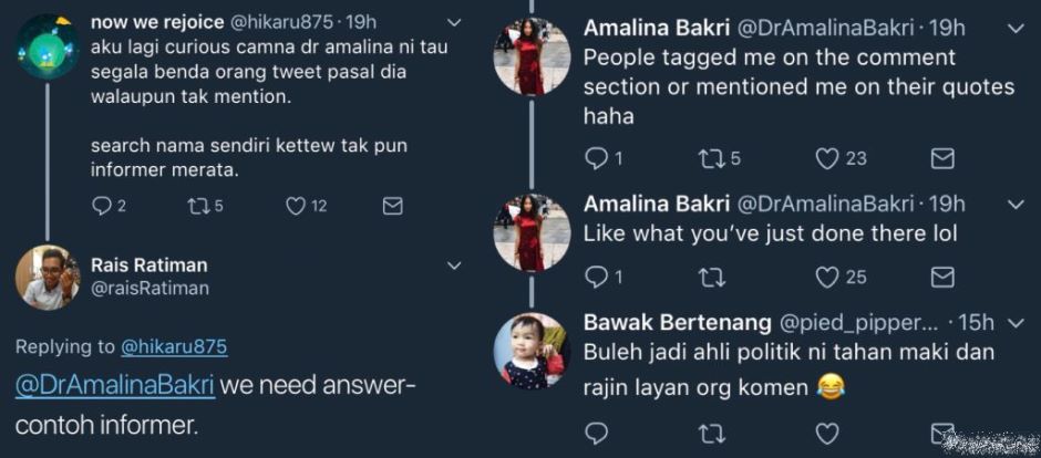 Seorang netizen, @hikaru875 memuat naik tweet: "Aku lagi rasa ingin tahu macam mana Dr Amalina ni tahu segala benda orang tweet pasal dia walaupun tidak mention. Cari nama sendiri ke, tak pun ada 'informer' merata."