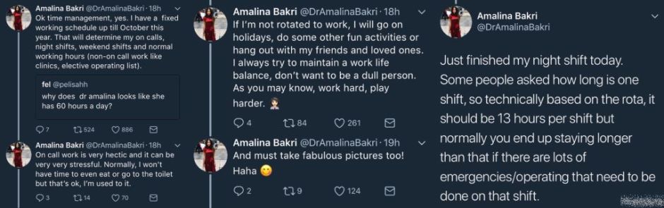Dr malina memberitahu pengikutnya kesibukan sebagai seorang pakar bedah memerlukan dia bekerja selama 13 jam bagi setiap syif dan kadangkala terpaksa berada di hospital lebih lama jika ada pembedahan yang perlu dijalankan.