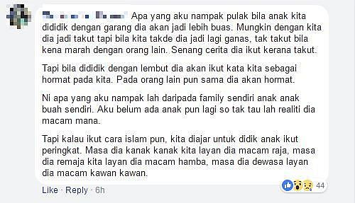 "Mungkin dengan kita dia jadi takut, tapi bila kita takde dia jadi lagi ganas, tak takut bila kena marah dengan orang lain. Senang cerita dia ikut kerana takut," tulis seorang netizen.