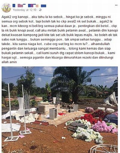 Dalam kejadian yang berlaku di Parit Sulong, Batu Pahat, Johor, pagi Isnin, pengusaha butik mendakwa kanopi yang disewa untuk majlis resepsi pelanggannya dibuka terlebih dahulu tanpa menunggu dia sampai di rumah pengantin.