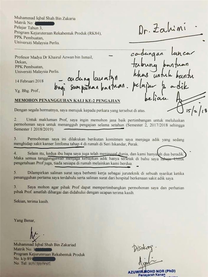 Menerusi surat tersebut, Muhammad Iqbal Shah berkata, dia meminta jasa baik dekannya agar mempertimbangkan permohonan untuk menangguhkan pengajian selama setahun bermula semester dua (sesi 2017/2018) hingga semester satu (sesi 2018/2019).