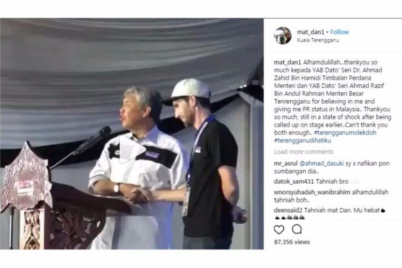 Itu reaksi pertama Mat Dan atau nama Islamnya Mohammad Kareef Daniel Abdullah sejurus Datuk Seri Dr Ahmad Zahid Hamidi mengumumkan kelulusan permohonannya mendapatkan status penduduk tetap Malaysia ketika merasmikan Ekspo Terengganu 2018 di sini, Isnin.