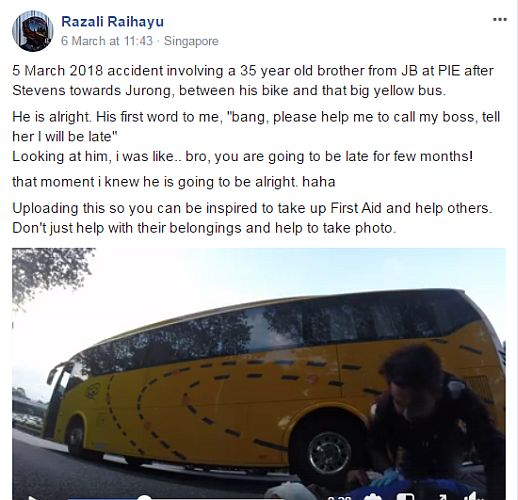 SEORANG eksekutif hal ehwal korporat sedang menunggang motosikal di Lebuhraya Pan-Island (PIE) petang Isnin apabila dia melihat seorang lelaki sedang terbaring di atas jalan bersebelahan sebuah bas dalam keadaan sakit dan mengalami pendarahan.