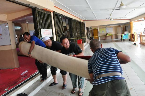 Ahli kariah masjid bergotong-royong mengangkat karpet. Foto Facebook Masjid Jamek Sungai Plong
