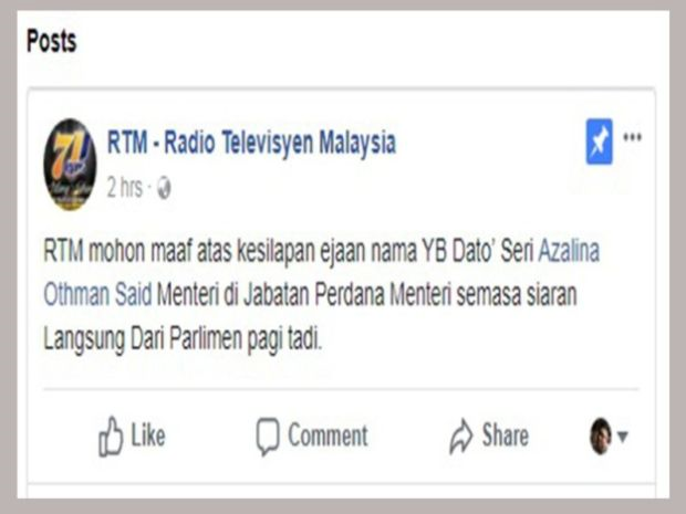 “RTM mohon maaf atas kesilapan ejaan nama YB Datuk Seri Azalina Othman Said, Menteri di Jabatan Perdana Menteri semasa siaran langsung dari Parlimen pagi tadi,” jelas RTM.
