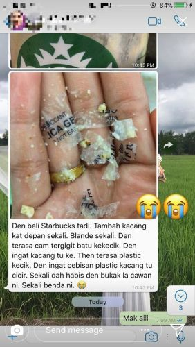 Ketika dalam perjalanan pulang, dia mula menyedari ada sesuatu yang tidak kena dengan minuman itu apabila terasa seperti ada cebisan plastik di dalam mulutnya.