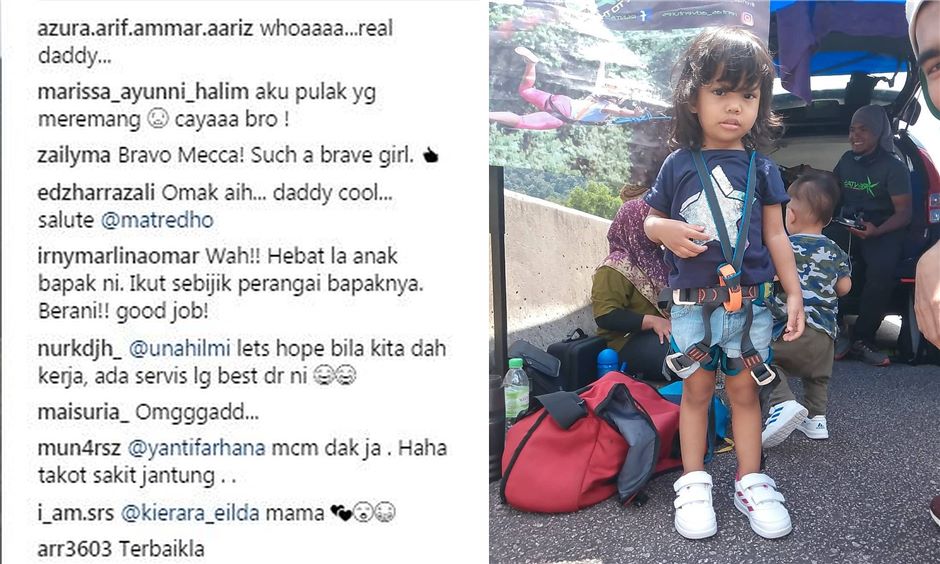 Mohd Redha Rozlan atau Mat Redho memuat naik video pengalamannya melakukan terjunan bersama anak sulungnya, Mecca Mikaela pada ketinggian 60 meter di sebuah jambatan mendapat perhatian netizen yang kagum dengan keberanian kanak-kanak itu.
