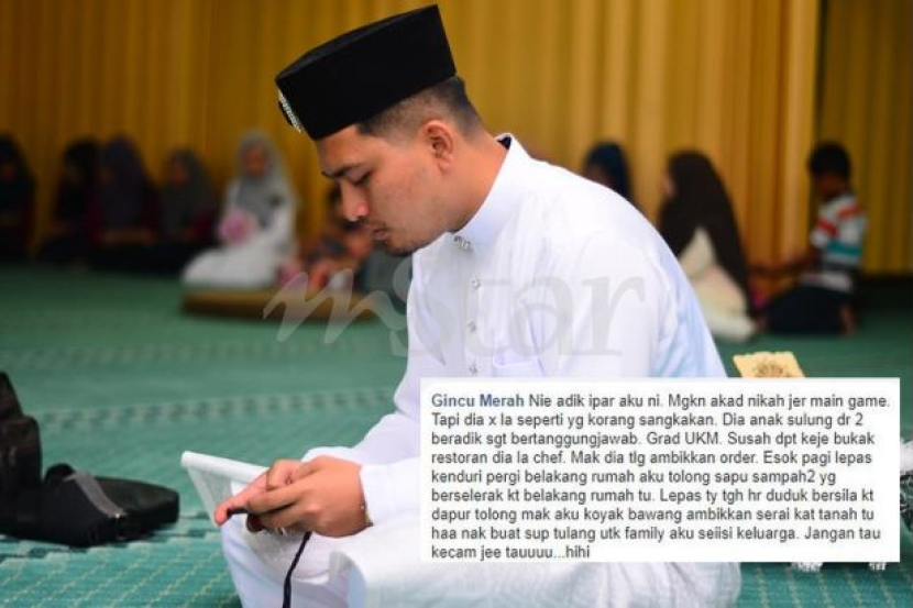 “Esok pagi lepas kenduri (kahwin) pergi belakang rumah aku tolong sapu sampah-sampah yang berselerak kat belakang rumah tu. Lepas tu tengah hari duduk bersila kat dapur tolong mak aku kupas bawang, ambik serai kat tanah tu haa... nak buat sup tulang untuk keluarga aku. Jangan tau kecam saja,” kata pengguna Facebook, Gincu Merah yang turut memberitahu adik iparnya pernah menuntut di Universiti Kebangsaan Malaysia (UKM).