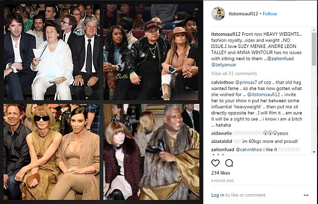 "Saya suka Suzy Menke dan Andre Leon Talley, Anna Wintour pun tiada masalah duduk bersebelahan mereka," tulisnya sambil menyertakan gambar-gambar mereka sebagai bukti kepada apa yang ditulisnya.