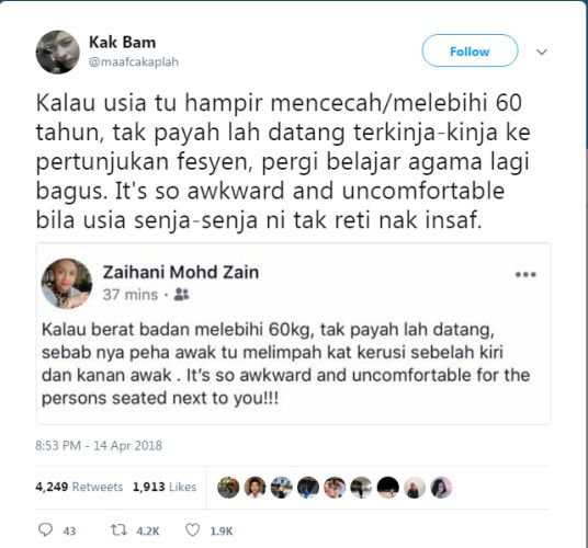 "It's so awkward and uncomfortale for the persons seated next to you (Ia nampak janggal dan tidak selesa bagi mereka yang duduk bersebelahan dengan awak)," tulisnya di Facebook.