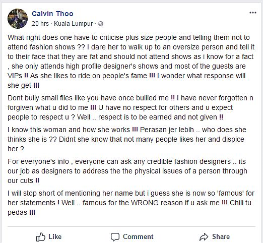 "Saya kenal wanita ini dan bagaimana dia bekerja. Perasan je lebih. Dia fikir dia siapa? Dia tak tahu ke ramai orang tak suka dia," dakwa Calvin dalam postingnya.