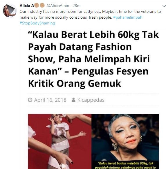 Menerusi tweet itu, dia turut menyertakan tanda pagar #PehaMelimpah dan #StopBodyShaming merujuk kepada kenyataan Facebook Zaihani.