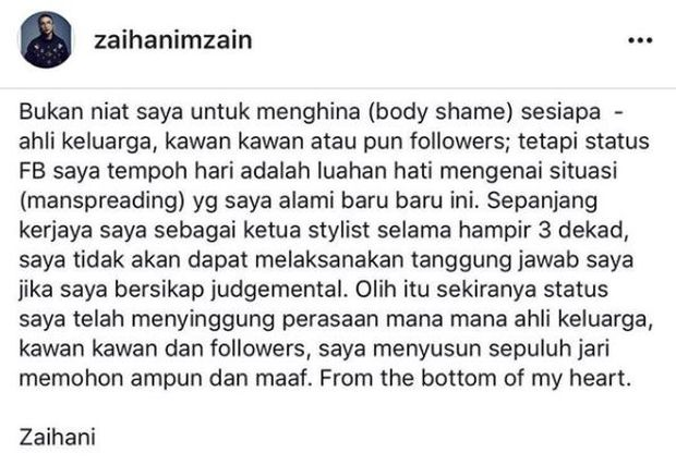 “Bukan niat saya untuk menghina ‘body shame’ (menghina badan seseorang) sesiapa – ahli keluarga, kawan-kawan atau pun para pengikut.