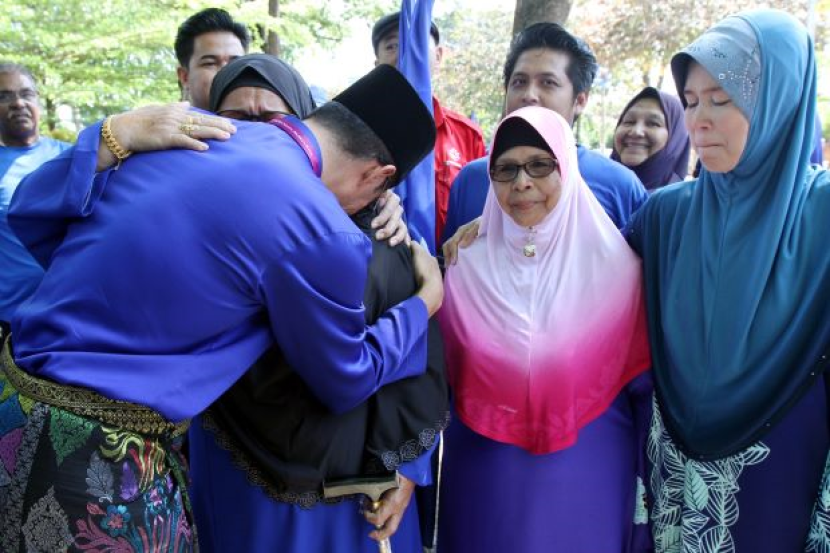 Calon Barisan Nasional, Adnan Seman tidak dapat mengawal perasaannya semasa memeluk ibunya berusia 67 tahun di luar pusat penamaan calon di Jalan Yaacob Latif sebaik sahaja proses pencalonannya selesai.