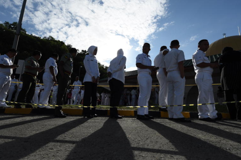 Anggota tentera berbaris untuk mengundi awal bagi Pilihan Raya Umum ke-14 di Sekolah Kebangsaan Pangkalan Tentera Laut Diraja Malaysia Sepanggar pagi ini. Foto: Bernama