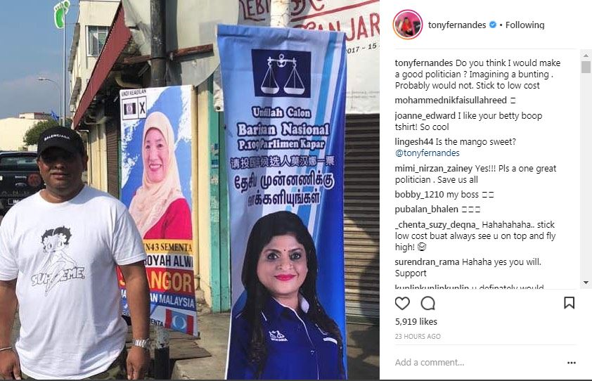 "Adakah anda rasa saya akan menjadi ahli politik yang baik? Sedang membayangkan sepanduk (calon). Mungkin tidak, kekal kepada penerbangan kos rendah," begitu kenyataan Fernandes menerusi gambar yang dimuat naik ke laman Instagramnya pada Ahad.