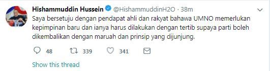 "Saya bersetuju dengan pendapat ahli dan rakyat bahawa Umno memerlukan kepimpinan baharu.