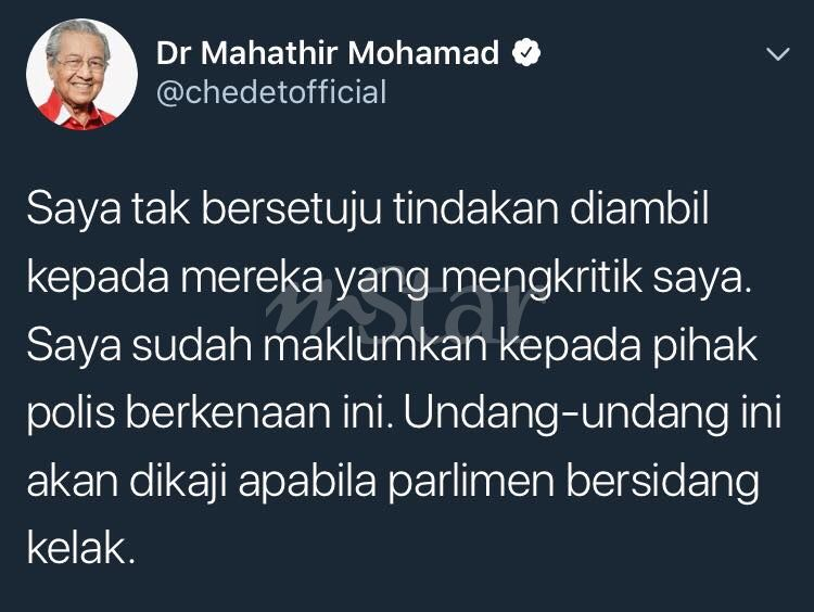 “Saya tak bersetuju tindakan diambil kepada mereka yang mengkritik saya. Saya sudah maklumkan kepada pihak polis berkenaan ini. Undang-undang ini akan dikaji apabila parlimen bersidang kelak,” ciapnya di Twitter.