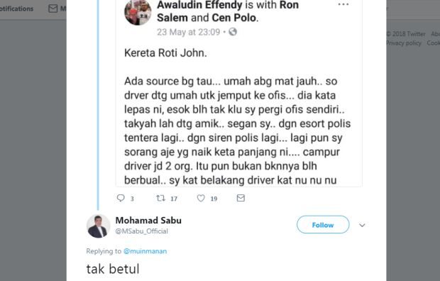 "Tak betul," tweetnya kepada seorang pengguna Twitter @muinmanan yang bertanyakan perkara itu kepada beliau.