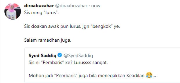 Dira kemudian membalas komen Syed Saddiq di Twitter, dengan mengakui dirinya seorang yang 'lurus'.