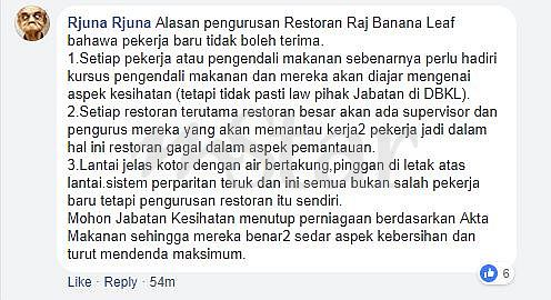 "Kami ingin menjamin bahawa Raj's Banana Leaf sentiasa melepasi pemeriksaan kesihatan yang dijalankan secara berkala.