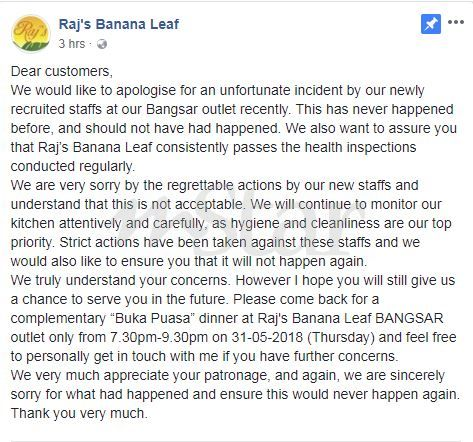 Permohonan maaf oleh pihak restoran Raj's Banana Leaf.