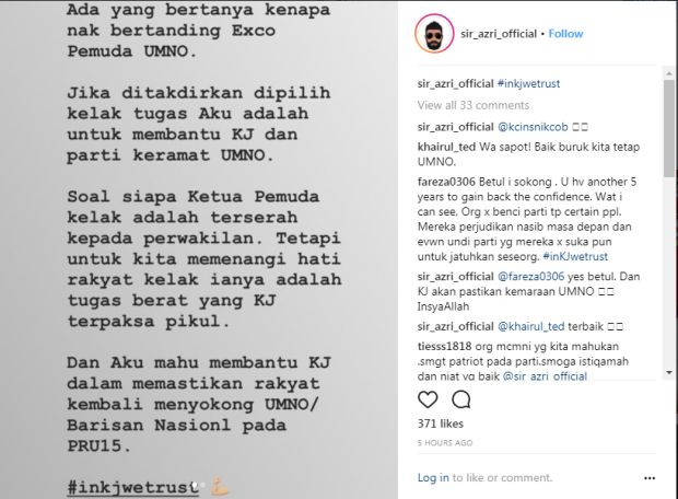 Papagomo membuat pengumuman untuk bertanding dalam barisan kepimpinan Pemuda Umno. Foto Instagram sir_azri_official