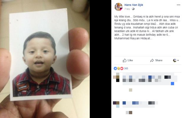 Allahyarham Muhammad Rayyan Hidayat Hairil Khan pergi buat selama-lamanya pada 18 April lalu dan pada 1 Syawal ini umurnya genap enam tahun.