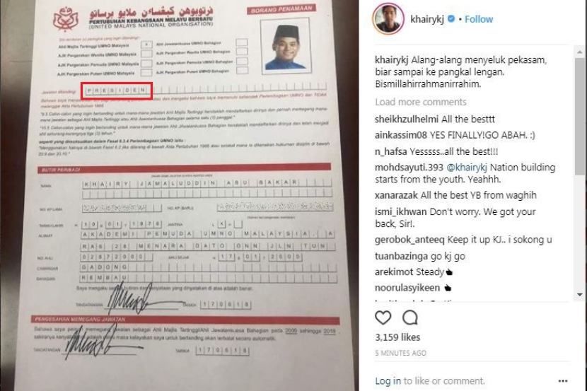 Terdahulu, Khairy memuat naik kertas pencalonannya di laman Instagram pada petang Ahad.