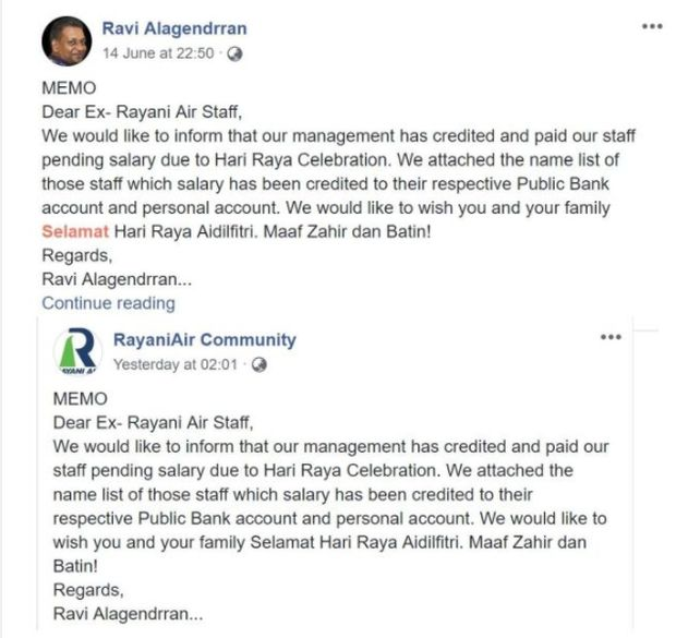 “Dengan membuat kenyataan melalui akaun Facebook milik Ravi atau media tidak mencukupi untuk menyelesaikan krisis pekerja Rayani Air,” menurut kenyataan itu.