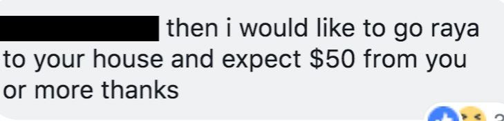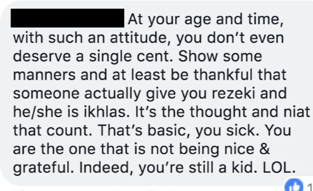 "Bagaimanapun, kalau saya saya tahu siapa orangnya, saya tak mahu dedahkan identitinya. Tujuan posting ini dikongsi untuk memberi kesedaran kepada komuniti Muslim bahawa kita mesti mengajar orang yang lebih muda bahawa raya bukanlah hari mengumpul duit raya atau berapa nilainya.