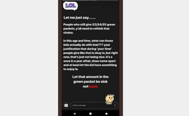 Dalam satu paparan skrin Insta Story yang muncul pada Sabtu, individu yang memuat naik posting tersebut mungkin menganggap dirinya wira apabila dia tidak setuju duit raya sebanyak RM5 atau kurang diberikan kepada kanak-kanak.