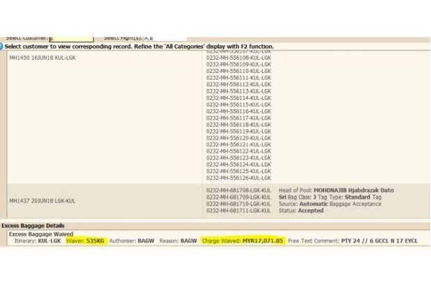 Terdahulu, paparan skrin yang tersebar menunjukkan caj RM17,071.85 dikecualikan bawah nama Mohd Najib Abd Razak bagi penerbangan MH1450 pada 16 Jun lalu.
