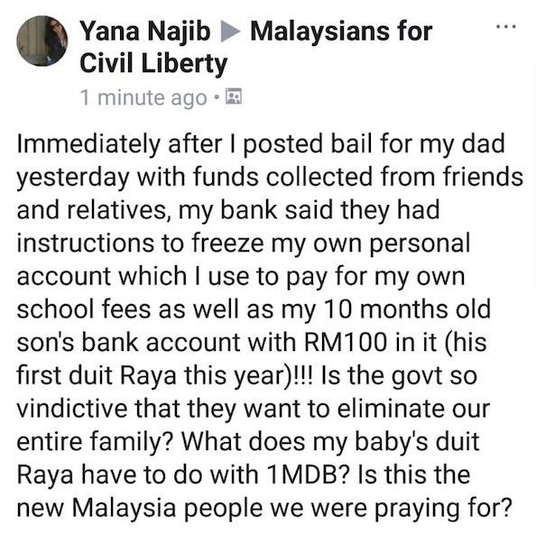 "Sebaik saya menjamin bapa saya semalam (Rabu) menggunakan wang yang dikumpul daripada rakan-rakan dan kaum keluarga, pihak bank memaklumkan mereka menerima arahan untuk membekukan akaun peribadi yang saya gunakan untuk membayar yuran persekolahan sendiri.