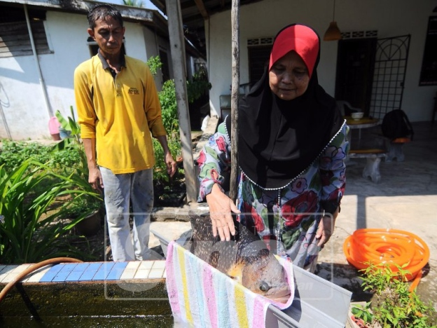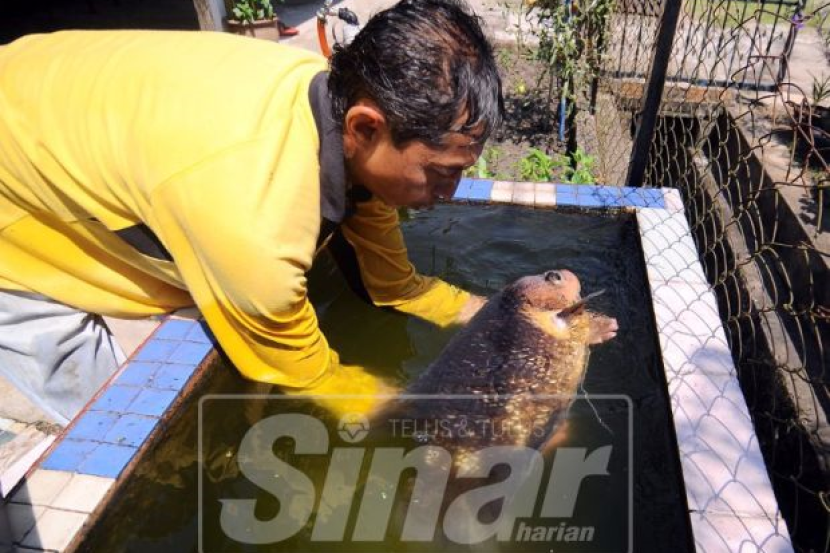 JERANTUT: Jika orang lain jadikan kucing, arnab atau burung sebagai binatang peliharaan kesayangan namun berbeza dengan seorang warga emas di Perumahan Awam Kos Rendah (PAKR) Kuala Tembeling. Siti Khadijah Mohd Amin, 70, setia bersama ikan kaloi yang menjadi peneman dan penghibur keluarganya sejak 20 tahun lalu. Ikan kaloi atau nama saintifiknya Osphronemus goramy itu menjadi kesayangan keluarganya malah turut menjadi perhatian penduduk setempat. Mula memelihara kaloi itu dengan hanya sebesar tiga jari, ikan itu terus membesar dan kini beratnya mencecah sehingga 15 kilogram (kg). Jinak dan suka apabila namanya dipanggil, kaloi akan segera datang. Siti Khadijah berkata, dia tidak memberi nama lain kepada ikan kesayangannya itu dan hanya memanggilnya kaloi sahaja. “Kami sekeluarga hanya panggil kaloi sahaja. Dulu kecil dan duduk di dalam akuarium tetapi kerana saiznya makin besar terpaksa dipindahkan ke dalam kolam khas yang dibina di hadapan rumah. “Bila nak bagi makan tu memang seronok, kadang-kadang akan timbul melompat nak makan,” katanya kepada Sinar Harian. Jelasnya selain memberikan makanan khas untuk ikan, kaloi gemar makan kangkung, timun muda serta gumpalan nasi. Siti Khadijah tidak rela berpisah bersama kaloi kesayangannya. “Setiap pagi dan petang sudah jadi rutin saya berikan makanan kepada Kaloi. Saudi menujukkan kaloi peliharaan keluarganya yang bersama mereka sejak 20 tahun lalu. “Kadang-kala tukar air di kolamnya dan memang tak sangka kaloi boleh hidup lama sehingga kini,” akuinya. Ujar Siti Khadijah, ikan tersebut diperoleh arwah suaminya Abdullah Imam Akob ketika menjala di Sungai Jelai. “Saya dan arwah suami pun pelihara kaloi ini dan anak-anak serta cucu turut sayangkan ikan ini. Ia ada nilai sentimental buat saya kerana mengingatkan pada arwah suami. “Apatah lagi sejak arwah meninggal dunia lima tahun lalu, kaloi ini jadi penghibur dan peneman saya,” katanya. Dalam pada itu, ibu kepada 12 anak dan 30 cucu itu mengakui pernah ditawarkan individu untuk menjual ikan tersebut. “Tapi saya tak sanggup nak melepaskannya. Biarlah dia bersama kami sekeluarga selagi boleh. “Tak boleh bayangkan sebab kaloi ini juga menjadi kesayangan anak-anak dan cucu,” ujarnya. Sementara itu anaknya, Saudi Abdullah, 50 memberitahu, kaloi tersebut istimewa dan menjadi kesayangan mereka sekeluarga. Menurutnya, ikan itu disifatkan peneman setia ibunya dan menganggap ia juga antara ahli keluarga sendiri.
