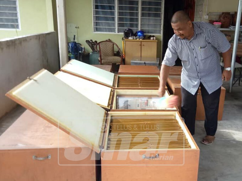 “Kotak kayu khas ini bagi elak keratan akhbar terlalu terdedah kepada udara. Masih banyak lagi belum ‘laminate’ serta dibingkaikan dan saya akan lakukan sedikit demi sedikit secara berterusan.