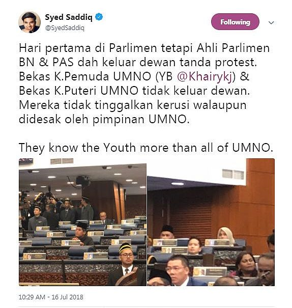 Menteri Belia dan Sukan, Syed Saddiq Syed Abdul Rahman turut mengulas mengenai kejadian itu di Twitter dan berkata, mereka yang kekal di dewan itu lebih mengetahui tentang belia.