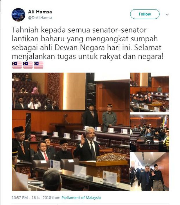 Menerusi tweet itu, Ali Hamsa mengucapakan tahniah kepada senator yang baru mengangkat sumpah.
