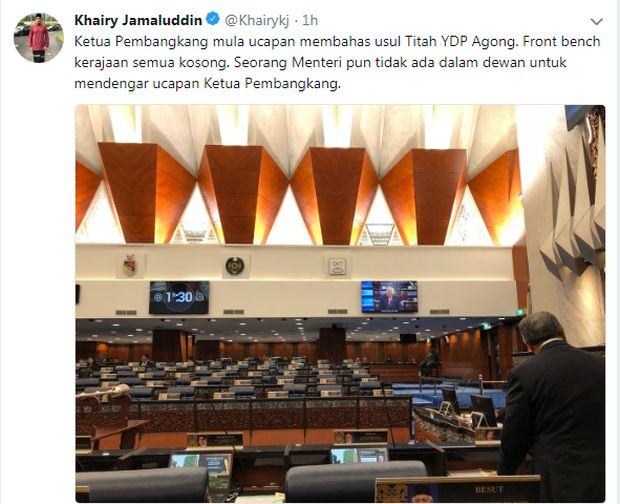 "Seorang menteri pun tidak ada dalam dewan untuk mendengar ucapan ketua pembangkang," tulis Khairy menerusi status yang dimuat naik di akaun Twitter miliknya, petang Rabu, sambil memuat naik gambar barisan hadapan blok kerajaan di dalam Dewan Rakyat yang kosong.
