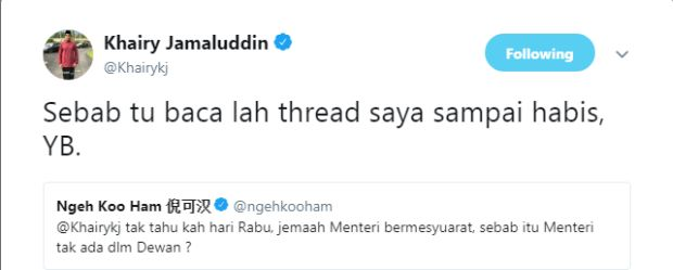Khairy membalasnya dengan berbaur sindiran: "Sebab tu baca lah thread (bebenang di Twitter) saya sampai habis, YB (Yang Berhormat)."
