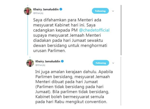 "Bila parlimen tidak bersidang, Kabinet boleh bermesyuarat semula pada hari Rabu mengikut convention (kebiasaan)," tambah Khairy.