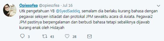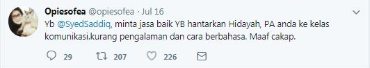 Che Wan Sofiatul Shima Wan Chik yang mengemukakan saranan itu dalam bentuk bebenang di Twitter pada Isnin berkata: "YB (Yang Berhormat) @SyedSaddiq, minta jasa baik YB hantarkan Hidayah, PA (personal assistant) anda ke kelas komunikasi.