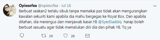 Che Wan Sofiatul Shima mendakwa, pegawai khas Syed Saddiq itu membalas pertanyaan pegawai seksyen istiadat dan protokol jabatan berkenaan yang ingin mengetahui tujuannya masuk ke Royal Box dengan biadab.