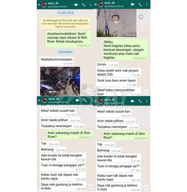 Namun katanya, Amir menghantar mesej pada awal pagi Jumaat memberitahu motornya mengalami kerosakan sewaktu di Slim River dan perlu dihantar ke bengkel.