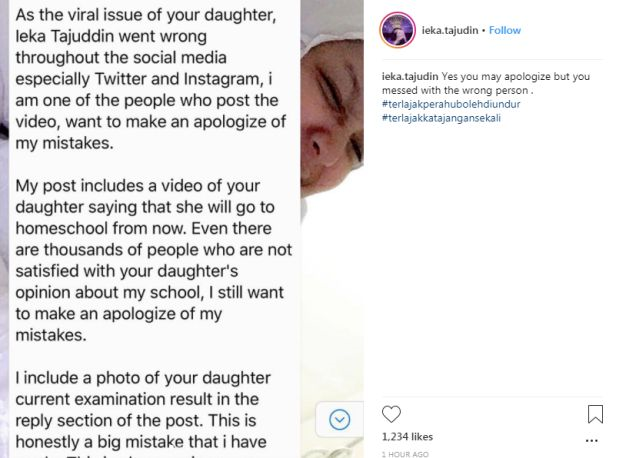 "Dan di kesempatan ini kami ingin memohon maaf di atas keterlanjuran menyebut nama sekolah tersebut dan tidak akan mengulanginya lagi," kata gadis berusia 17 tahun itu.