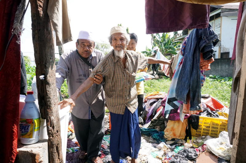Pegawai Khas kepada Anggota Parlimen Pokok Sena, Zulkifli Ismail (kiri) membantu Ishak berjalan ketika mengadakan lawatan di rumahnya di Lorong Gedebang.